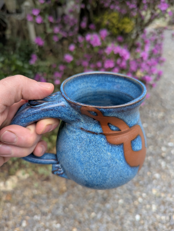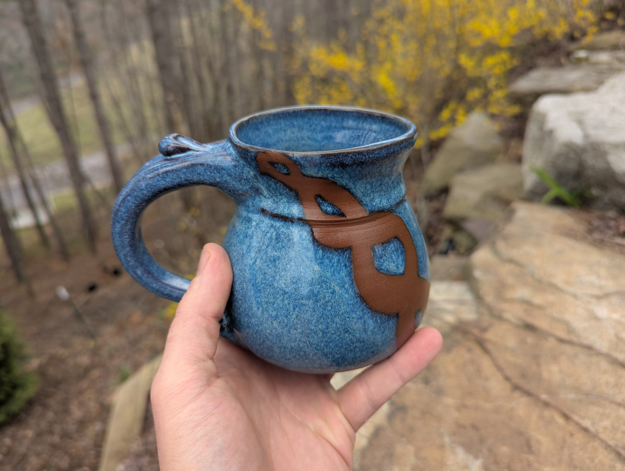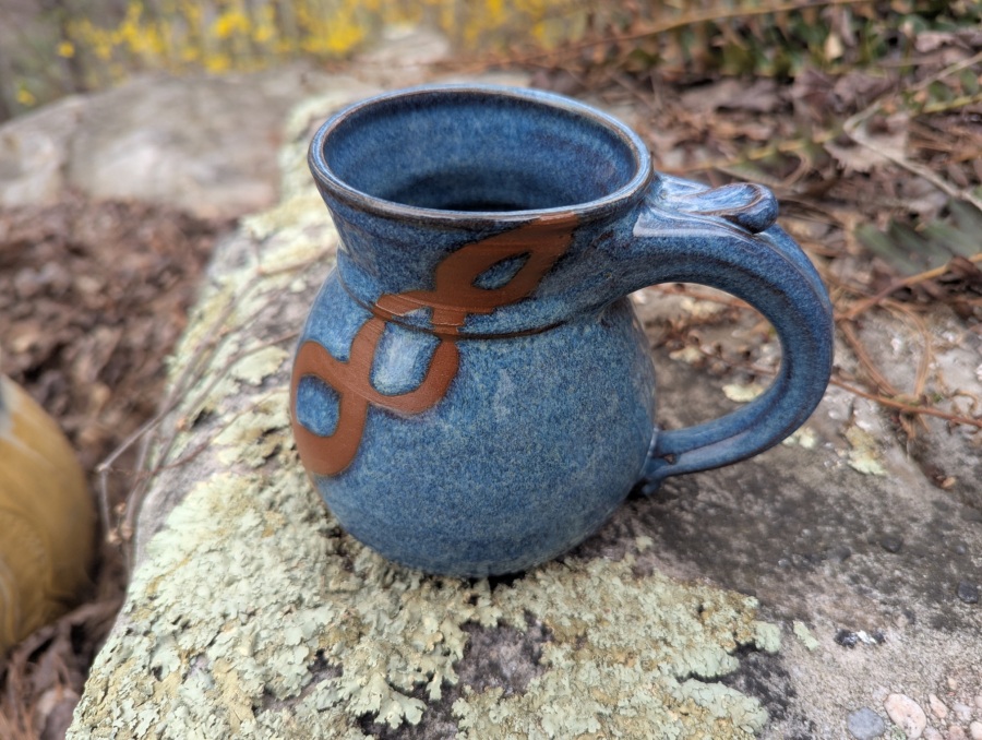 This hand thrown pottery mug in our Slate Blue glaze with Rust Chain has an amazing feel to it as well as having a good design. Hand thrown on the pottery wheel from a durable stoneware clay, this 4" mug comfortably holds 16oz. A wax resist chain design decorates this mug leaving the beautiful rust color of the clay. Our chain design is inspired by the double helix. The bottom of each mug is signed and dated as well as polished smooth.