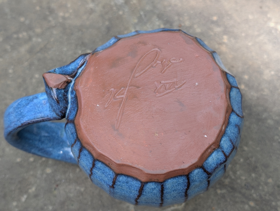 These hand thrown and carved pottery mugs are in our Slate Blue glaze. Each mug measure approx 4" and comfortably hold 16 oz. Each of these lovely mugs are hand thrown on the pottery wheel from a durable stoneware clay. Our mugs are hand carved and trimmed, then a handle pulled and thumbrest placed to ensure it fits your hand perfectly. Each of these mugs has been hand carved in our Ridged pattern and glazed in Slate Blue glaze, which has amazing depth of color.