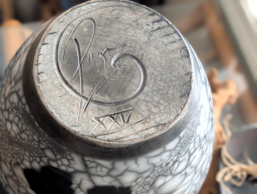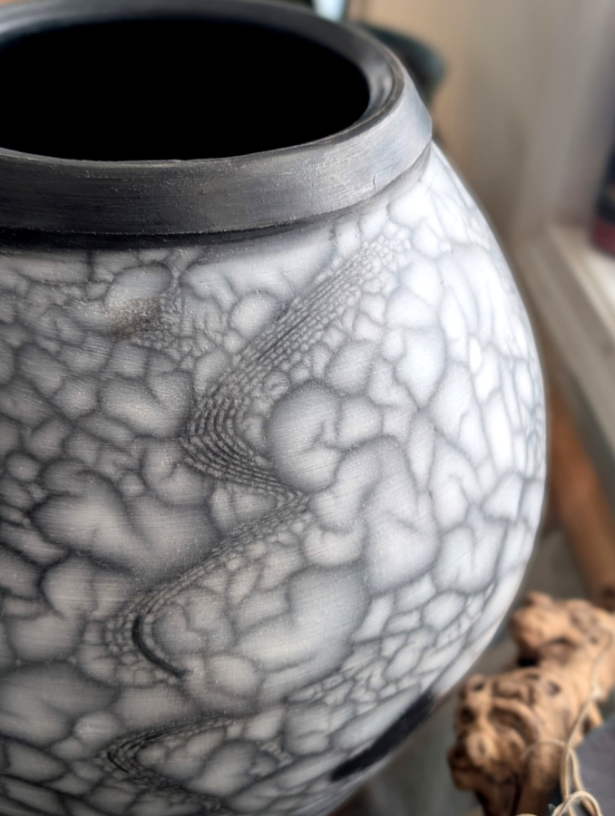 Beautifully soft and ornate, this wheel thrown raku pottery vase has an elegant black and white marbled design. The marbled raku pottery design is from a clay slip resist and smoke fired raku process called naked raku. A clay slip is fired over top of these pots and as it cracks off, the smoke colors the clay body through the cracks. Producing a truly unique black and white marbled design that could never be duplicated. This marbled naked raku pottery piece is then burnished a buffed again to be very smooth and soft.
