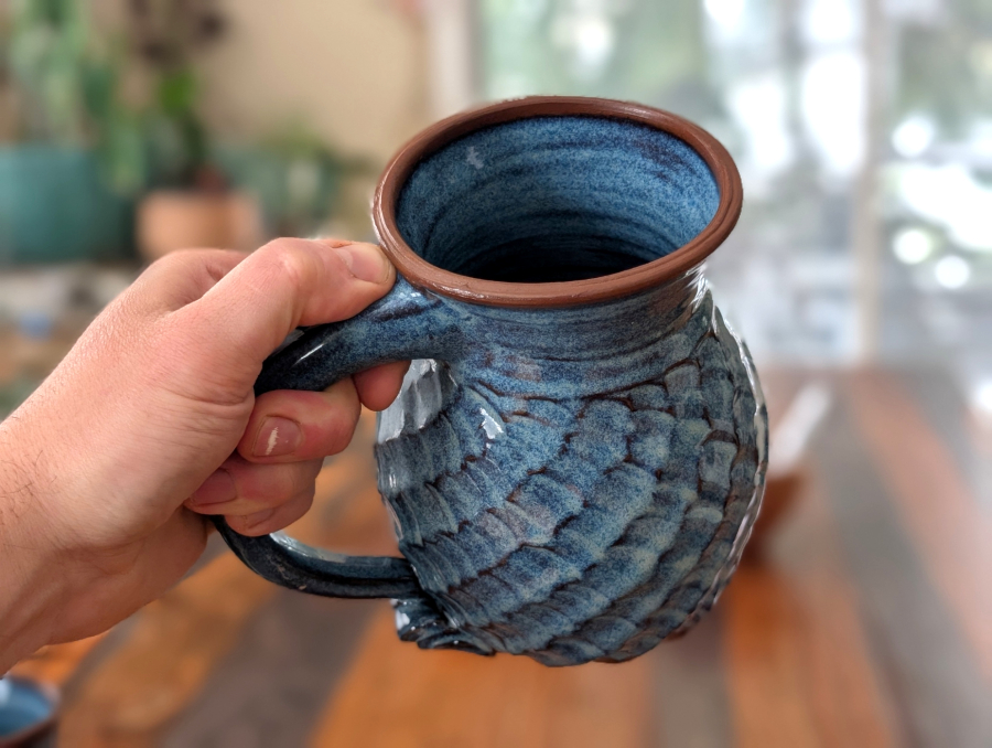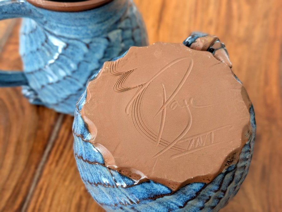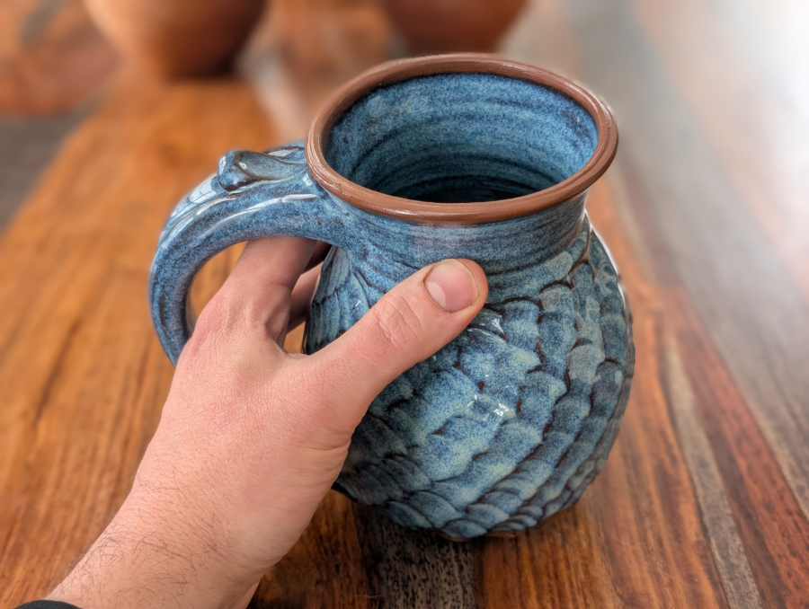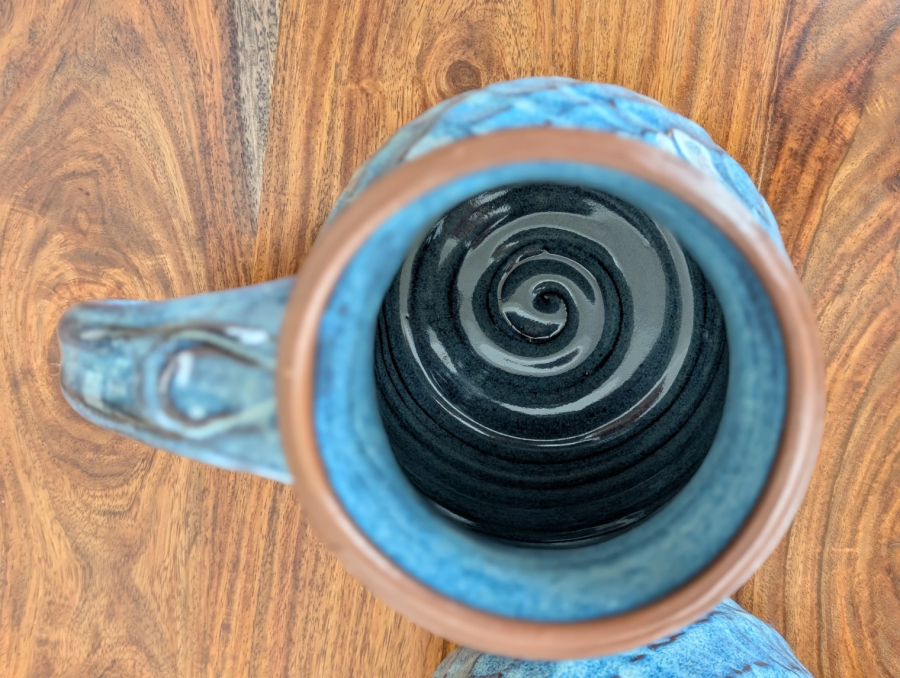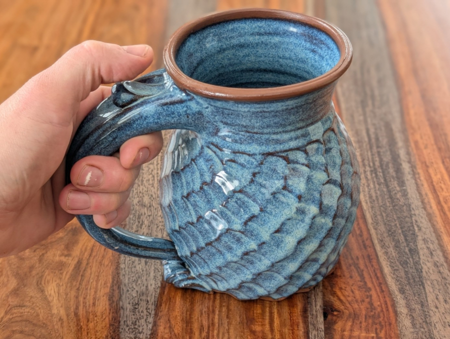 Each hand thrown mug is as unique as you are, which is the nature of all things handmade. As with all handmade pottery expect slight variation in color and size, as well as the carved pattern in this huge mug.