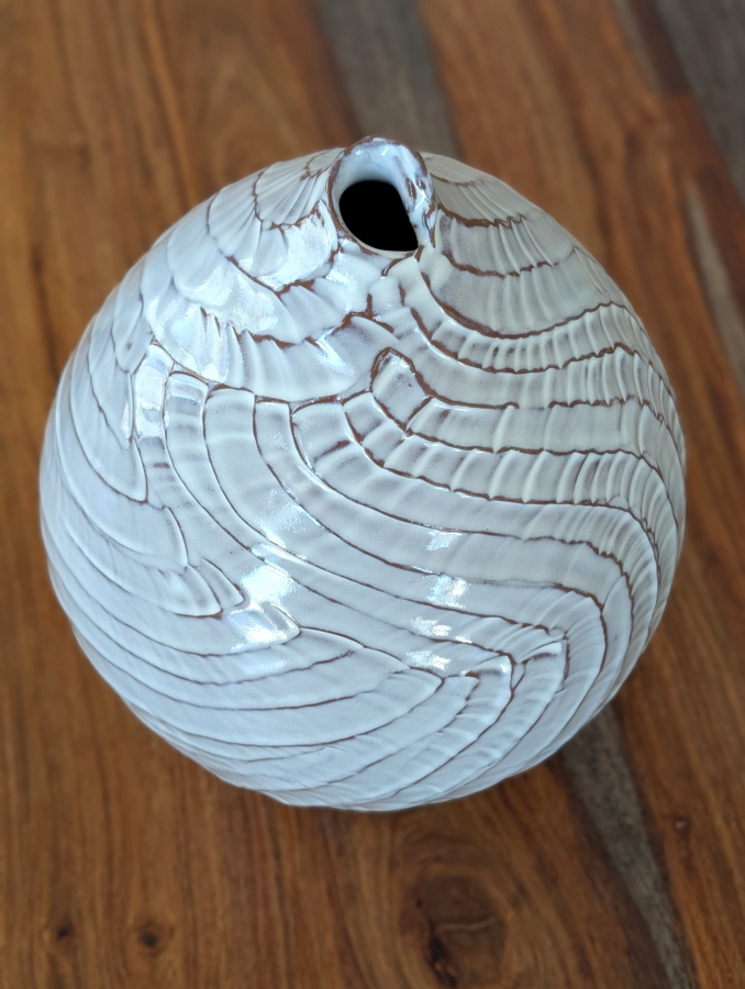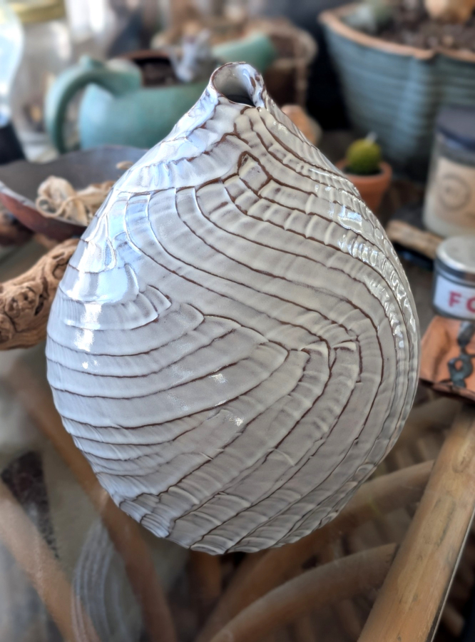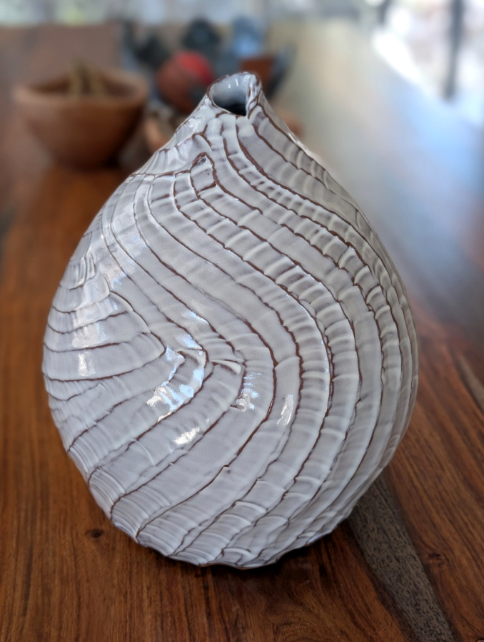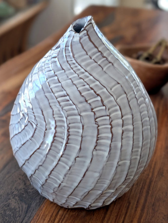 This hand thrown vase or bottle has a beautiful teardrop shape and is hand carved in our Ridged design. Standing 10"x 6" this vase is as unique as it is beautiful. Hand thrown on the potters wheel with a durable stoneware clay, then the still wet clay was carved and altered to show movement of the once pliable clay. The Shale glaze shows off the texture and movement of this vase nicely. Such an unusual vase that stands beautifully on its own or with a unique flower or dried grasses.