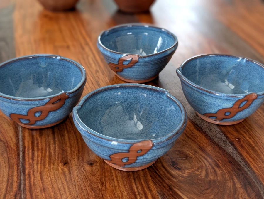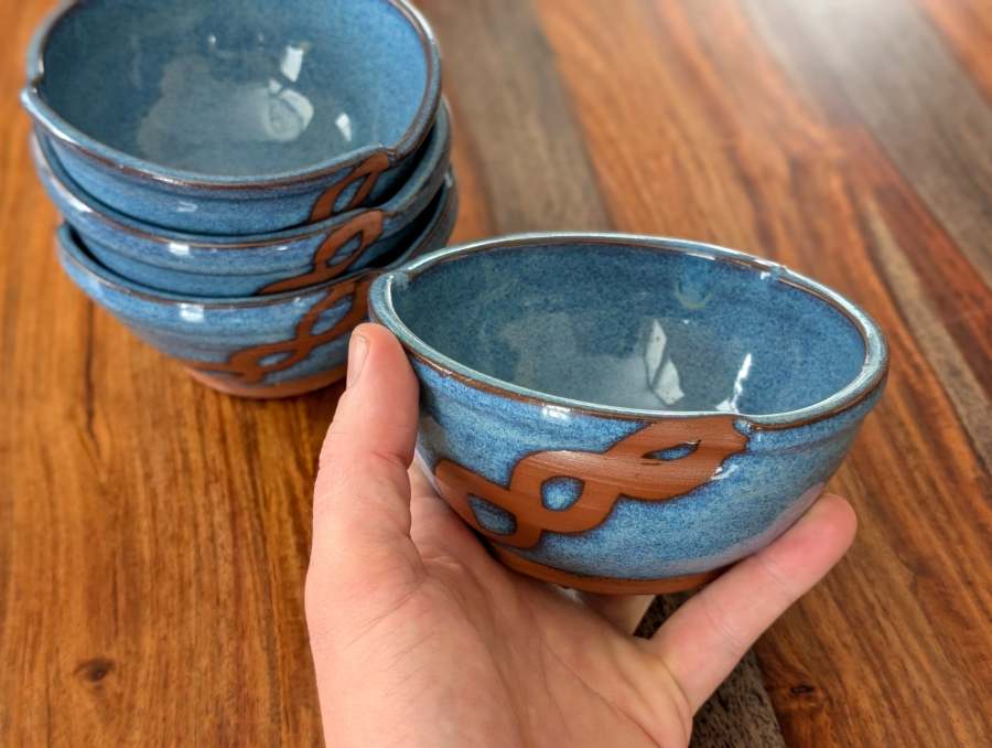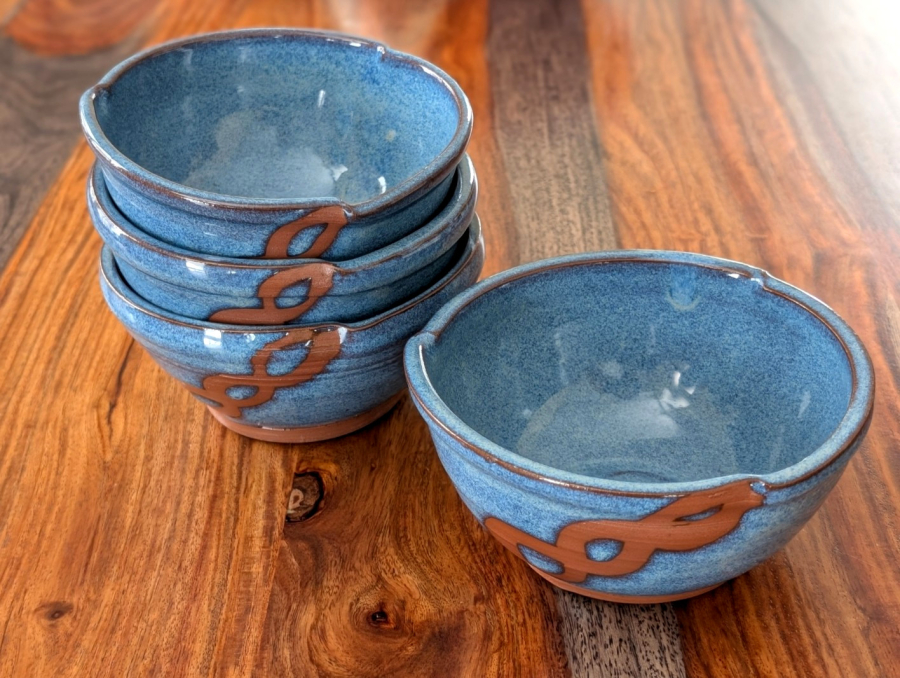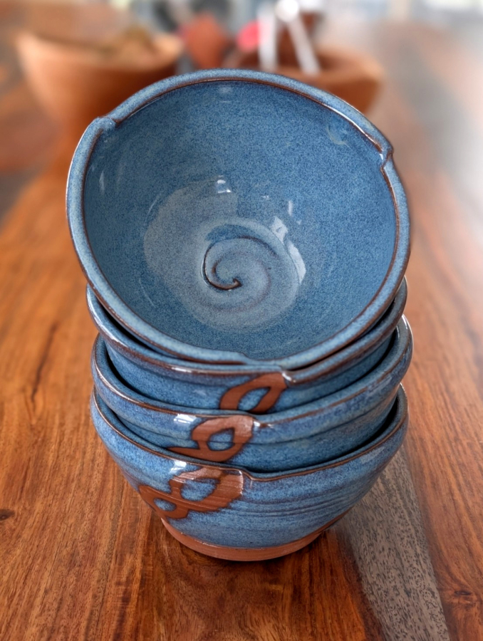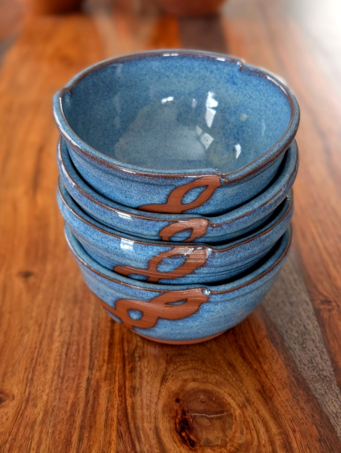 Measuring approx. 4" x 2" these little hand thrown pottery snack bowls or rice bowls are one of the most used in our home. Each of these four blue snack bowls can be used for all kinds of things from dipping sauces, or when you need more than just a hand full of peanuts. Not to mention it's perfect snack bowl for a scoop of ice cream =)