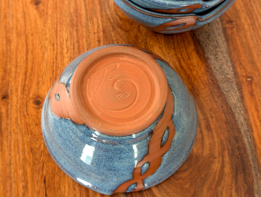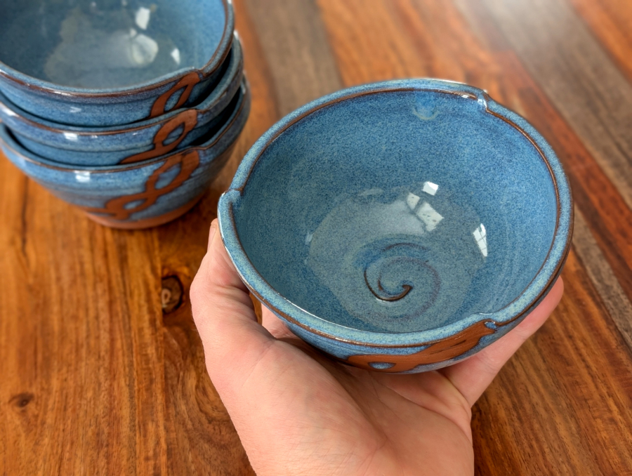 Each of these little blue bowls were hand thrown on the pottery wheel from a durable stoneware clay and designed to to be versatile. All of our snack bowls stack well and nest inside of each other for easy storage. The beautiful yet subtle blue glaze with a rust chain is sure to brighten your home as well as enrich your cooking and eating experience.