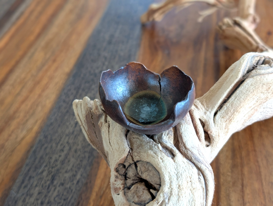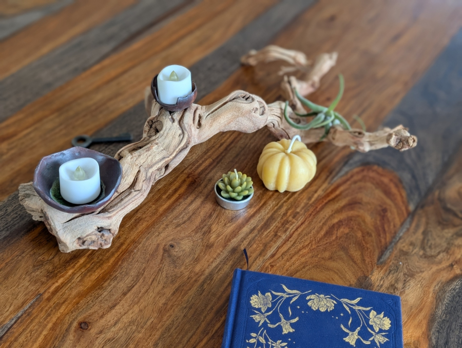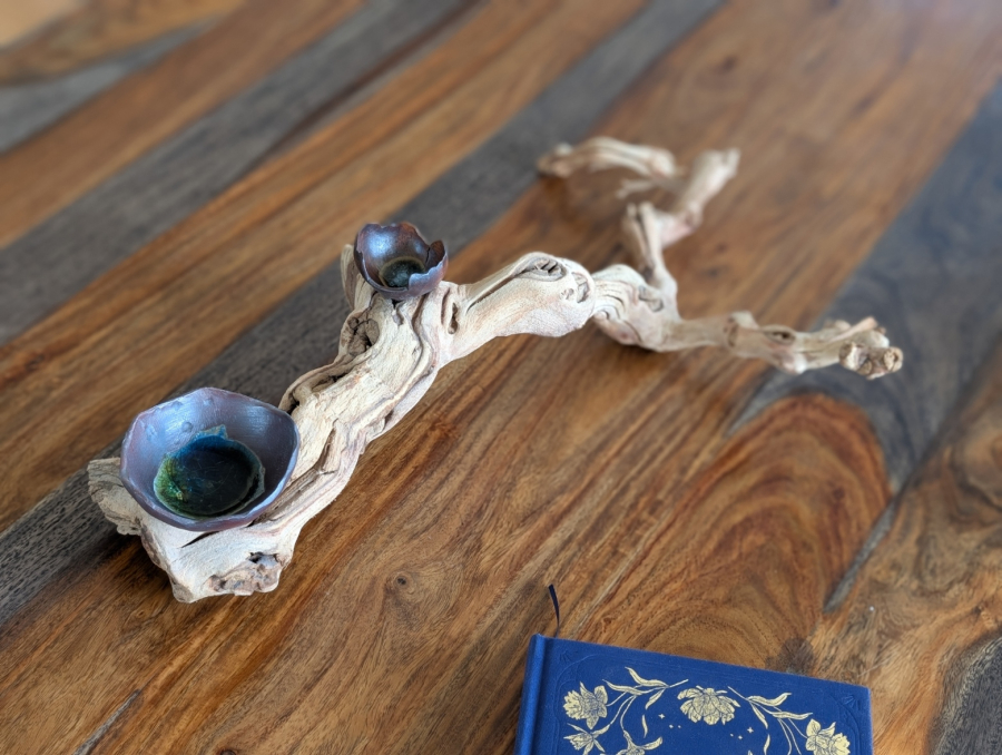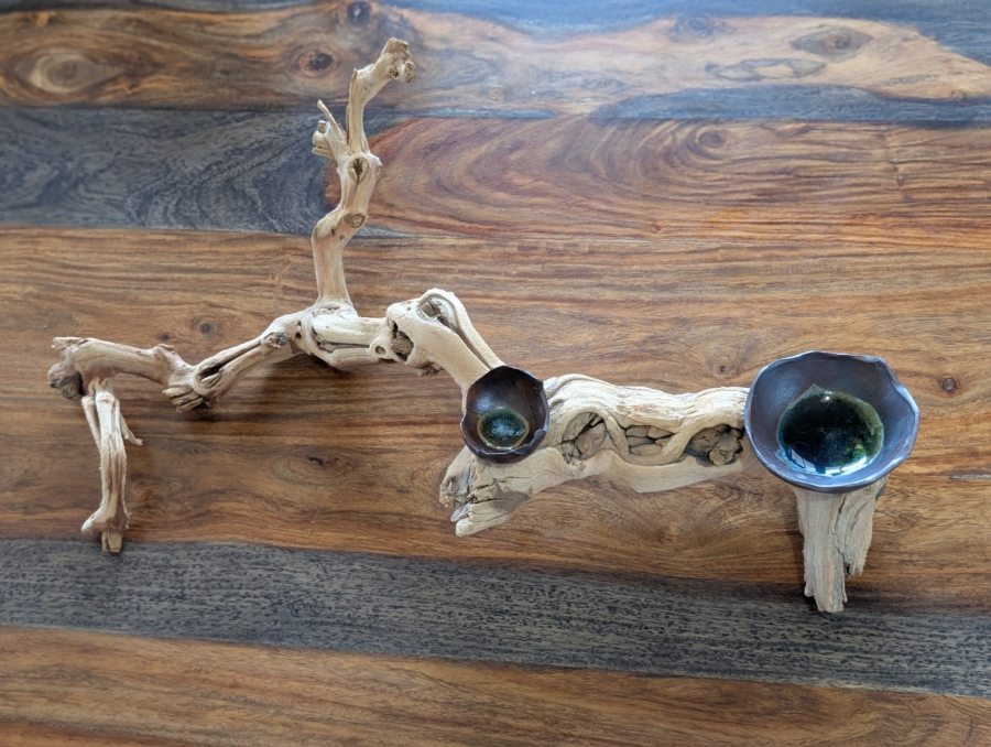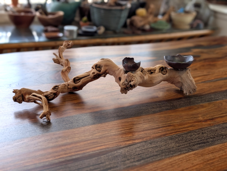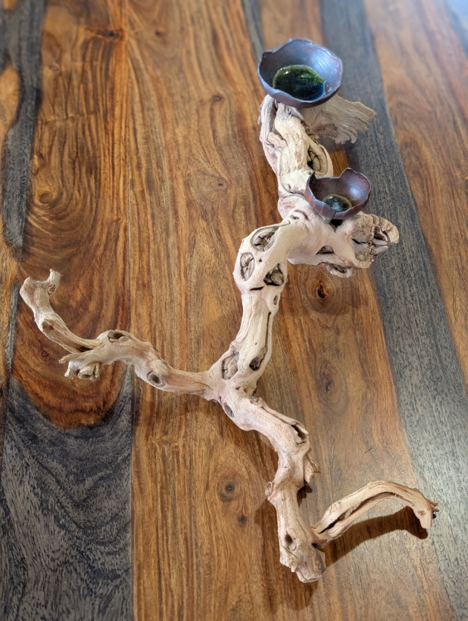This large 14" Candelabra centerpiece has two handmade pottery candle holders that are securly attached. This rustic Candelabra will make an excellent dining room table centerpiece. Created from sandblasted grapevine with two hand crafted bowls with glass melted at the bottom. Truly an interesting one of a kind Candelabra Centerpiece that is sure to liven up your dining room table.