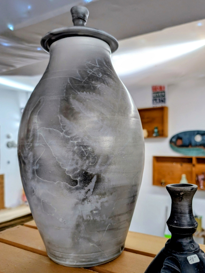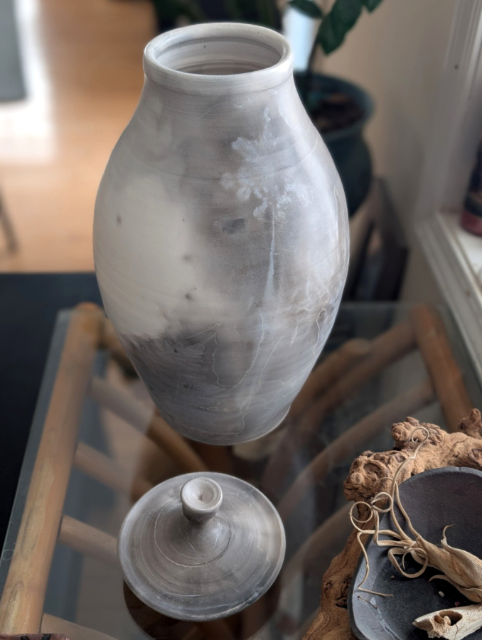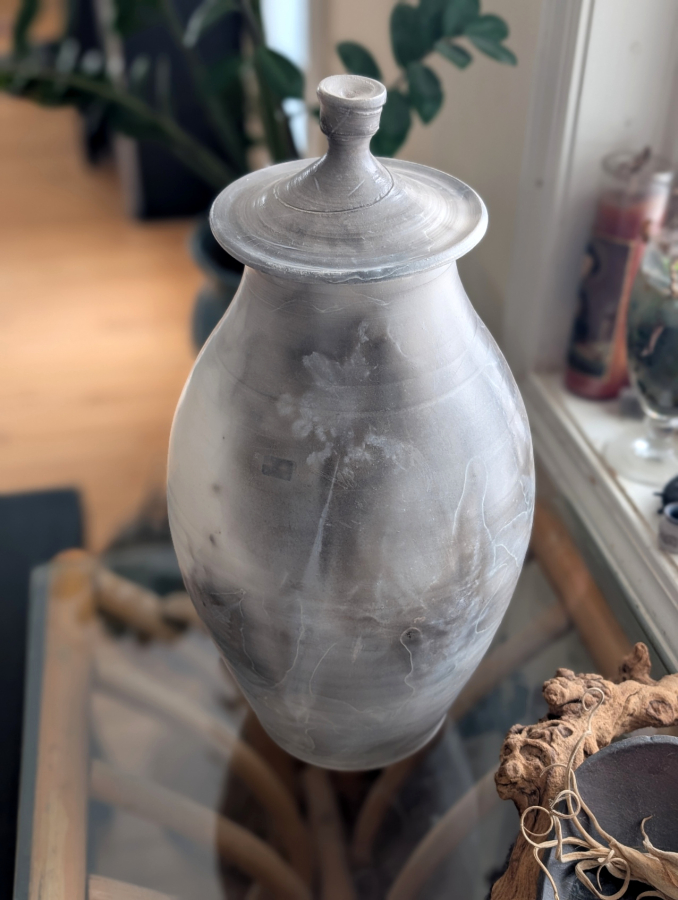 This raku lidded jar has a classic Grecian design combined with modern aesthetic, achieved using an ancient Japanese way to fire.