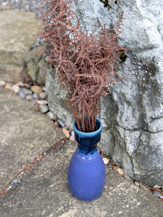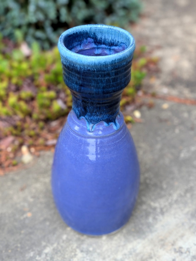 This large 14"x 7" hand thrown stoneware pottery flower vase has an amazing presence about it. The bright Purple glaze with a dark blue glaze cascading down the sides is stunning. After this piece was hand thrown on the pottery wheel it was then carved and trimmed while the clay was still wet. Inspired by the mountains of North Carolina where is was created.