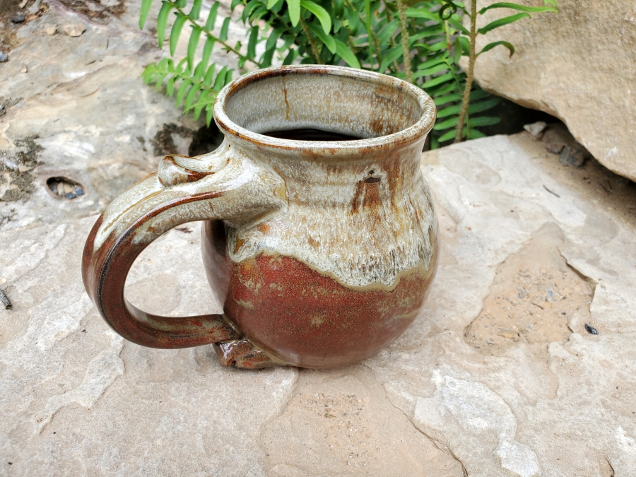 This hand thrown stoneware pottery mug has an amazing feel to it as well as having a good design. Carefully crafted from a stoneware clay to fit your hand, this 4" mug comfortably holds 16oz. After being hand thrown on the wheel a handle is pulled and a thumb rest is placed for both comfort and grip. Our rustic Brownstone glaze has wonderful earth tones and rich depth of color perfect for your new coffee mug.