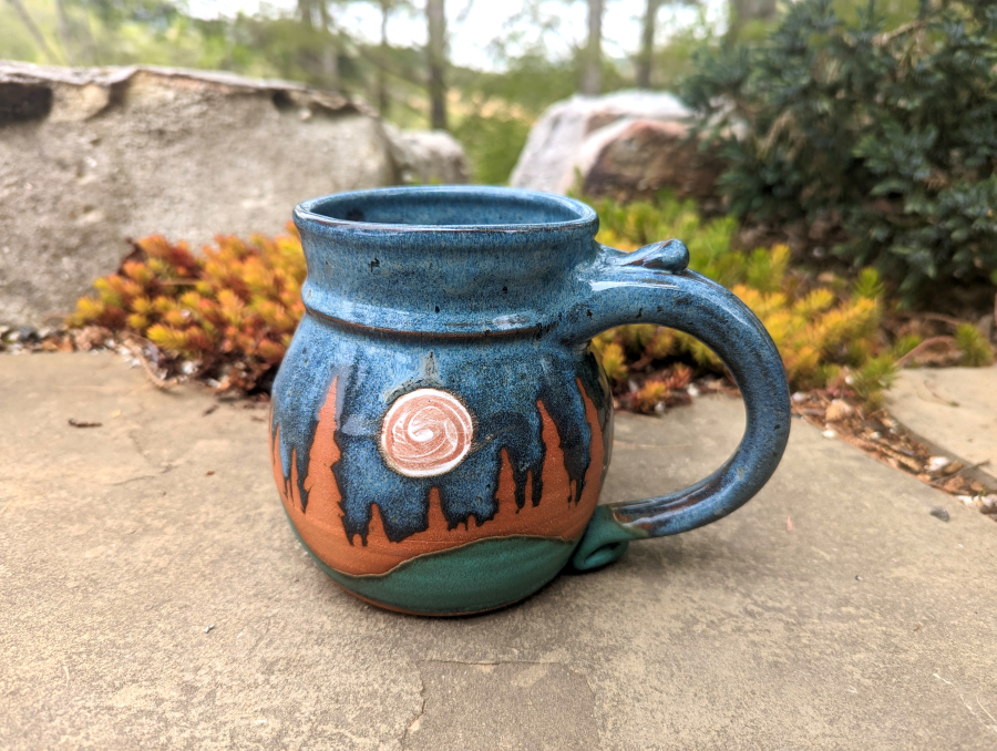This huge slate blue pottery mug has a hand painted rolling mountain landscape and full moon on it. Each mug is unique as the Mountainscapes that surrounds us here in the Mountains of North Carolina. Each however will feature trees, rolling hills, and a full moon that inspired this series. Feel free to request a photo before we ship to ensure you will be happy with the one we made you. =)